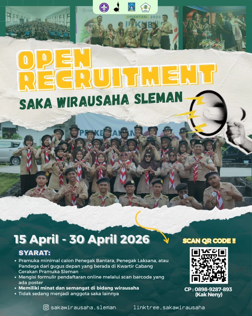 SLEMAN – Saka Wirausaha Sleman secara resmi mengumumkan pembukaan pendaftaran anggota baru (Open Recruitment) bagi Pramuka Penegak dan Pandega di wilayah Kabupaten Sleman.